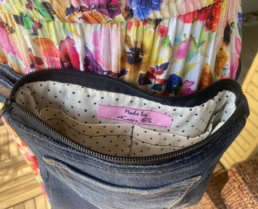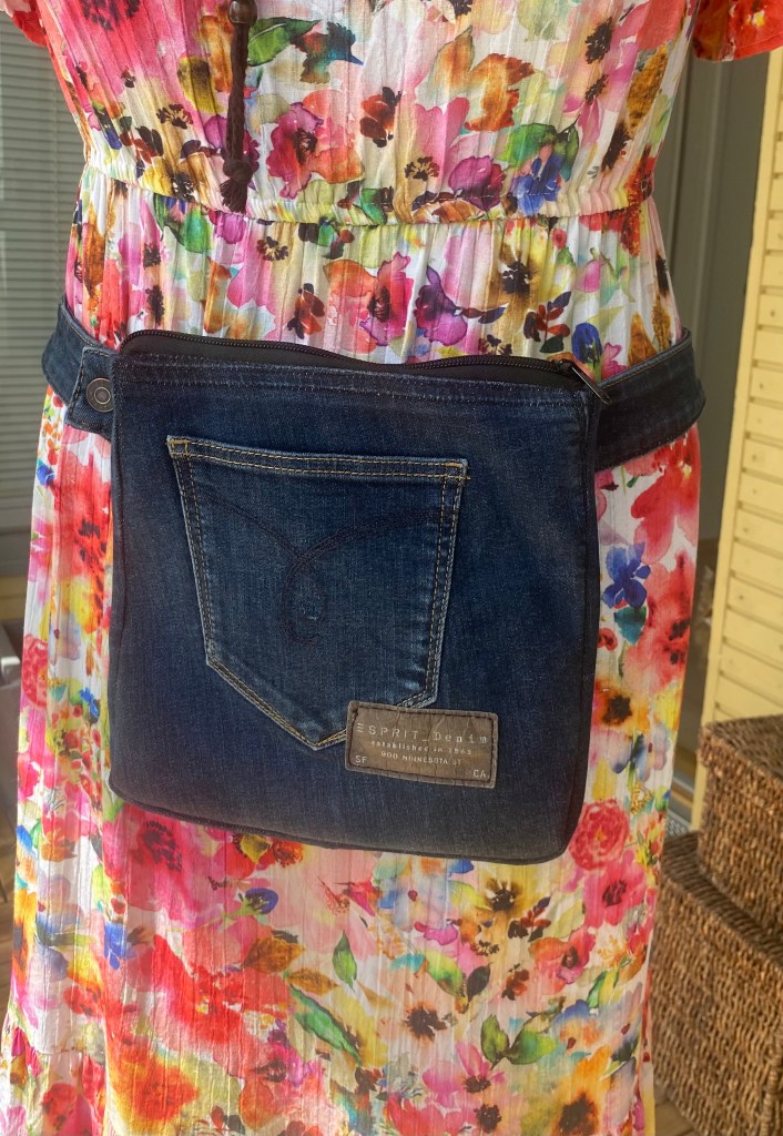 vyölaukku farkkukankaasta, koossa 23cm x 23cm.