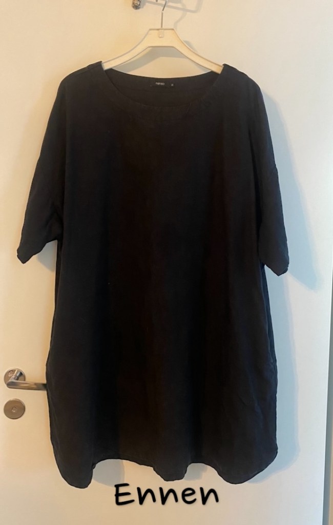 Pellava mekkoon haluttiin uutta ilmettä ja pituutta. Hihansuihin lisättiin beigeä pellavakangasta. Lisäksi tehtiin juhlaviin tilaisuuksiin irroitettava kukka rintakoriste.